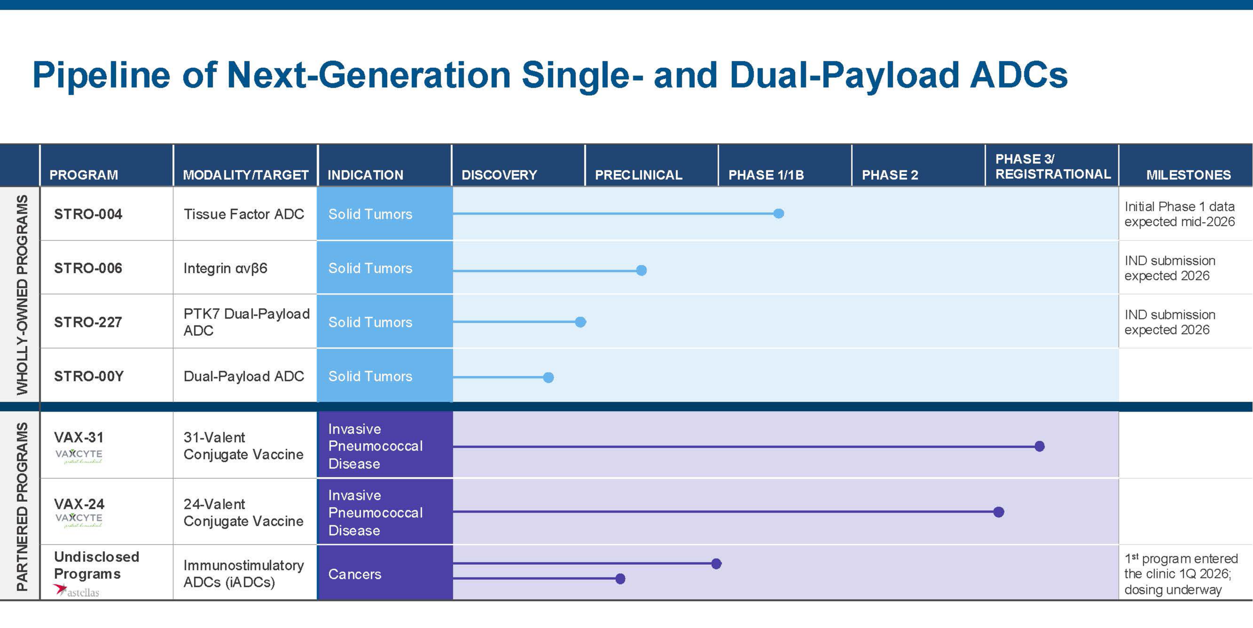 We are advancing multiple candidates in parallel to address large market opportunities. Our single-payload ADCs, STRO-004 and STRO-006, are designed with best-in-class potential for complex targets across multiple tumor types where competition remains limited. Our dual-payload ADC programs represent a new class of supercharged ADCs designed to overcome resistance and delay disease progression. By combining distinct payloads, these programs have the potential to deliver improved clinical benefit, tolerability, and durability of response.